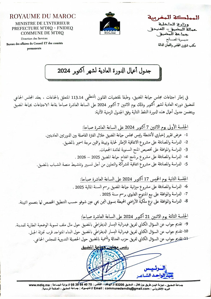 جدول أعمال الدورة العادية لمجلس جماعة المضيق حسب الجدولة الزمنية التالية